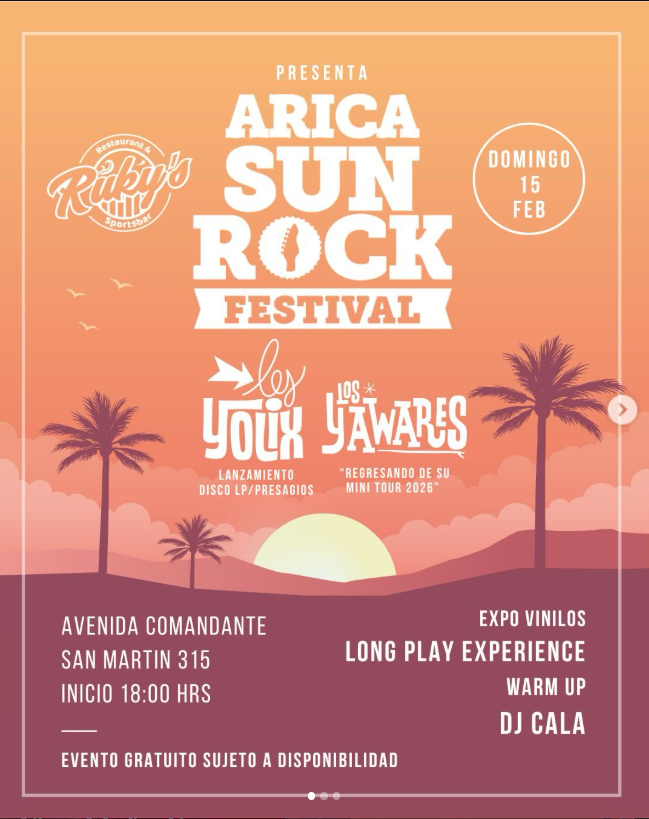 Este domingo 15 de febrero, la ciudad de Arica será escenario del Sun Rock Festival, un encuentro musical gratuito organizado por Ruby’s Restaurant & Sport Bar en su terraza ubicada en Avenida Comandante San Martín 315, desde las 18:00 horas.